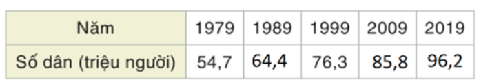 Em hãy thống kê số dân của Việt Nam từ năm 1979 đến năm 2019 bằng cách hoàn thành bảng sau:
