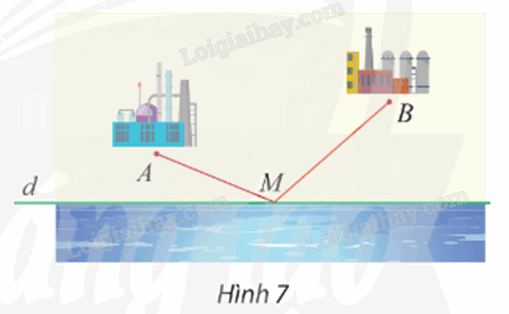 Cho hai điểm A, B là vị trí của hai nhà máy nằm cùng một phía bờ sông là đường thẳng d. Tìm trên bờ sông một địa điểm M để xây dựng một trạm bơm sao cho tổng chiều dài đường ống dẫn nước từ trạm bơm về hai nhà máy là ngắn nhất (Hình 7).