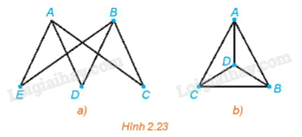 - Đồ thị Hình 2.23 a) có 5 đỉnh, trong đó đỉnh A và B đều có bậc 3, các đỉnh còn lại E, D, C đều có bậc 2 nên mỗi đỉnh đều có bậc không nhỏ hơn \(\frac{{5 - 1}}{2} = \frac{4}{2} = 2\). Do đó, theo định lí 4 (suy ra từ định lí Dirac), đồ thị này có đường đi Hamilton. Một đường đi Hamilton của đồ thị này là CBDAE.