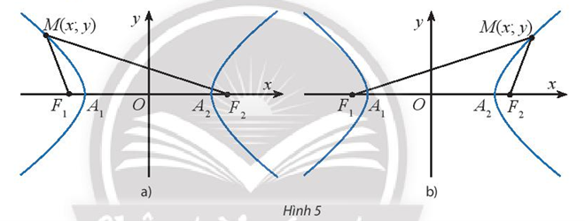 b) Giả sử điểm \(M(x;y)\) thuộc nhánh đi qua \({A_2}(a;0)\) (Hình 5b). Sử dụng kết quả đã chứng minh được ở câu a) kết hợp với tính chất \(M{F_1} - M{F_2} = 2a\) đã biết để chứng minh \(M{F_2} + M{F_1} = 2\frac{{cx}}{a}\). Từ đó, chứng minh các công thức: \(M{F_1} = a + \frac{c}{a}{x_0};M{F_2} = - a + \frac{c}{a}{x_0}\)