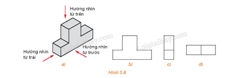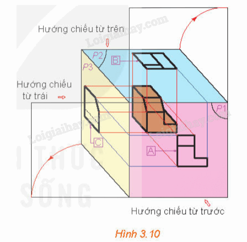 Hình chiếu đứng (hướng chiếu từ mặt trước ra sau), hình chiếu cạnh (hướng chiếu từ trái sang), hình chiếu bằng (hướng chiếu từ trên nhìn xuống).