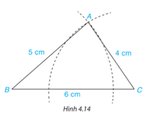 - Vẽ cung tròn tâm \(B\) bán kính \(5\;{\rm{cm}}\) và cung tròn tâm \(C\) bán kính \(4\;{\rm{cm}}\) sao cho hai cung tròn cắt nhau tại điểm \(A({\rm{H}}.4.14)\).