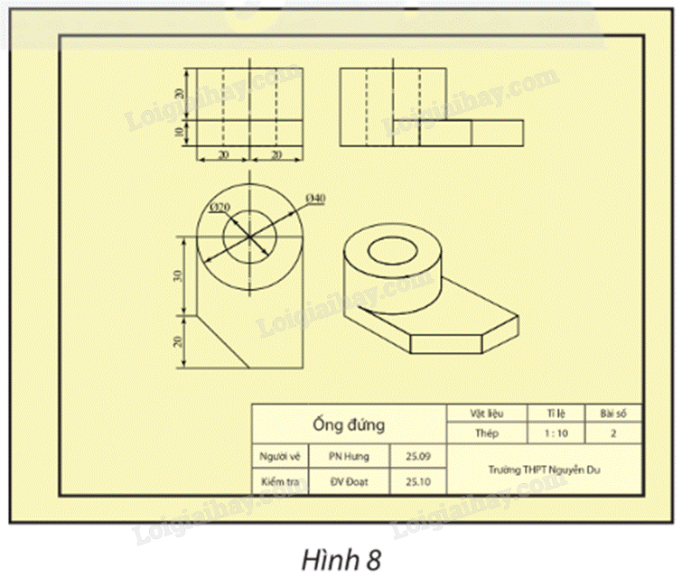 Đọc bản vẽ kĩ thuật trong Hình 8 và dùng các thông tin đọc được để trả lời các câu hỏi sau:
