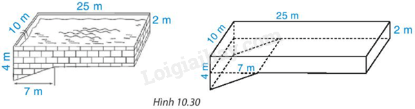 Một bể bơi có hình dạng và kích thước như Hình 10.30. Hình dạng của bể bơi được ghép bởi một hình hộp chữ nhật và một hình lăng trụ đứng tam giác. Khi bể bơi đầy ắp nước thì nó chứa bao nhiêu mét khối nước (bỏ qua độ dày của thành bể).