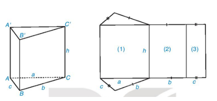 Quan sát hình lăng trụ đứng tam giác ABC. A'B'C' và hình triển khai của nó. Hãy chỉ ra sự tương ứng giữa các mặt bên và các mặt hình chữ nhật của hình khai triển.