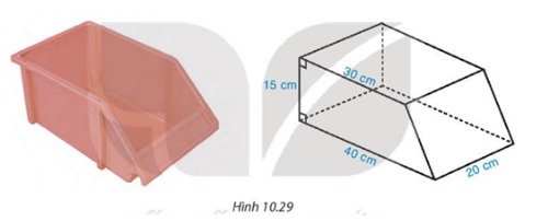 Một chiếc khay đựng linh kiện bằng nhựa, có dạng hình lăng trụ đứng, đáy là hình thang vuông với độ dài hai cạnh đáy là 30 cm, 40 cm và các kích thước như hình 10.29. Tính thể tích của khay.