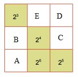 \(\begin{array}{l}A = {2^{12}}:{2^6}:{2^5} = {2^{12 - 6 - 5}} = {2^1} = 2;\\B = {2^{12}}:{2^1}:{2^3} = {2^{12 - 1 - 3}} = {2^8};\\C = {2^{12}}:{2^8}:{2^4} = {2^{12 - 8 - 4}} = {2^0} = 1;\\D = {2^{12}}:{2^0}:{2^5} = {2^{12 - 0 - 5}} = {2^7};\\E = {2^{12}}:{2^7}:{2^3} = {2^{12 - 7 - 3}} = {2^2}\end{array}\)
