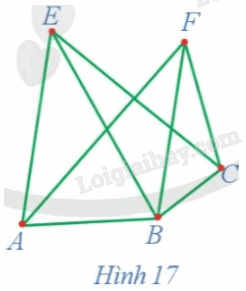Ta có: d(A) = 3, d(B) = 4, d(C) = 3, d(E) = 3, d(F) = 3. Đồ thị G ở Hình 17 gồm 5 đỉnh, mỗi đỉnh của đồ thị đều có bậc không nhỏ hơn \(\frac{5}{2}\) . Do đó, theo định lí Dirac, đồ thị G có ít nhất một chu trình Hamilton.