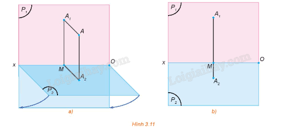 Trong không gian cho điểm A và hai mặt phẳng hình chiếu đứng, hình chiếu bằng (P1), (P2) cắt nhau theo giao tuyến Ox. Gọi A1 và A2 lần lượt là hình chiếu đứng và hình chiếu bằng của điểm A (H.3.11a). Quay mặt phẳng (P2) quanh Ox sao cho (P2) trùng với (P1). Khi đó hai điểm A1 và A2 cùng thuộc mặt phẳng (P1) (H.3.11b).