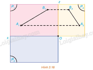 Trong HĐ2, gọi (P3) là mặt phẳng hình chiếu cạnh và A3 là hình chiếu cạnh của A. Gọi Oz là giao tuyến của (P1) và (P3), Oy là giao tuyến của (P2) và (P3). Quay mặt phẳng (P2) quanh Ox sao cho (P2) trùng với (P1) và quay mặt phẳng (P3) quanh Oz sao cho (P3) trùng với (P1), khi đó ba điểm A1, A2, A3 cùng thuộc mặt phẳng (P1) (H.3.14).