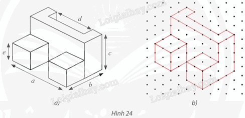 Tìm các kích thước a, b, c, d, e của chi tiết cơ khí trong Hình 24a có hình biểu diễn được vẽ trên giấy kẻ ô li là Hình 24b với quy ước mỗi cạnh của tam giác đều biểu diễn độ dài 1 cm.