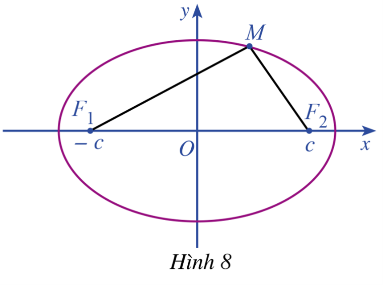 Giả sử đường elip (E) là tập hợp các điểm M trong mặt phẳng sao cho \(M{F_1} + M{F_2} = 2a\), ở đó \({F_1}{F_2} = 2c\) với \(0 < c < a\). Ta chọn hệ trục tọa độ \(Oxy\) có gốc là trung điểm của đoạn thẳng \({F_1}{F_2}\). Trục \(Oy\) là đường trung trực của \({F_1}{F_2}\) và \({F_2}\) nằm trên tia \(Ox\) (Hình 8). Khi đó \({F_1}( - c;0),{F_2}(c;0)\) là các tiêu diểm của elip (E)