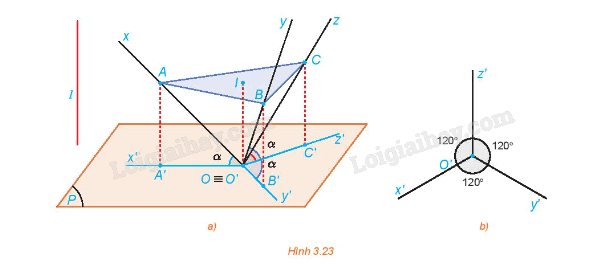 Cho hình tứ diện vuông OABC có các cạnh OA, OB, OC bằng nhau và lần lượt nằm trên các trục Ox, Oy, Oz đôi một vuông góc. Xét phép chiếu vuông góc lên mặt phẳng (P) đi qua O sao cho các trục Ox, Oy, Oz tạo với (P) các góc bằng nhau (H.3.23a). Gọi A', B', C' lần lượt là hình chiếu của A, B, C.