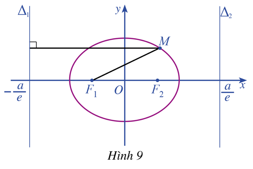 Xét đường thẳng \({\Delta _1}:x = - \frac{a}{e}\) với mỗi điểm \(M\left( {x;y} \right) \in \left( E \right)\) (Hình 9), tính: