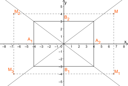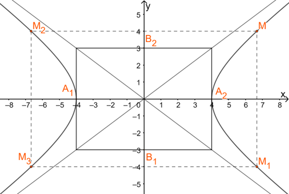 Bước 2: Vẽ hai đường chéo của hình chữ nhật sơ sở. Điểm \(M(\frac{{20}}{3};4)\) thuộc (H). Do đó các điểm \({M_1}(\frac{{20}}{3}; - 4),{M_2}( - \frac{{20}}{3};4),{M_3}( - \frac{{20}}{3}; - 4)\) thuộc (H).