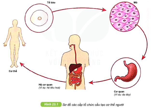 Quan sát hình 23.1 viết sơ đồ thể hiện mối quan hệ giữa các cấp tổ chức của cơ thể từ thấp đến cao.