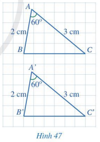 Cho hai tam giác ABC và A’B’C’ (Hình 47) có: AB = A’B’ = 2 cm, \(\widehat A = \widehat {A'} = 60^\circ \), AC = A’C’ = 3 cm. Bằng cách đếm số ô vuông, hãy so sánh BC và B’C’. Từ đó có thể kết luận được hai tam giác ABC và A’B’C’ bằng nhau hay không?