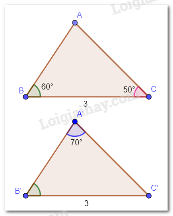 Cho hai tam giác ABC và A’B’C’ thỏa mãn: BC = B’C’ = 3 cm, \(\widehat B = \widehat {B'} = 60^\circ ,\widehat C = 50^\circ ,\widehat {A'} = 70^\circ \). Hai tam giác ABC và A’B’C’ có bằng nhau không? Vì sao?