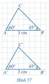 Cho hai tam giác ABC và A’B’C’ (Hình 57) có: \(\widehat A = \widehat {A'} = 60^\circ \), AB = A’B’ = 3 cm, \(\widehat B = \widehat {B'} = 45^\circ \). Bằng cách đếm số ô vuông, hãy so sánh BC và B’C’. Từ đó có thể kết luận được hai tam giác ABC và A’B’C’ bằng nhau hay không?