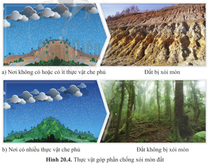 Quan sát hình 20.4 và cho biết khi có mưa lớn, điều gì sẽ xảy ra với đất ở trên đồi không có hoặc ít cây che phủ. Cầm làm gì để khắc phục điều đó?