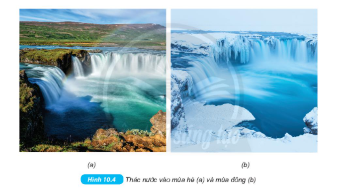 Quan sát hình 10.4 và trình bày sự chuyển thể đã diễn ra ở thác nước khi chuyển sang mùa hè (hình a) và khi chuyển sang mùa đông (hình b)