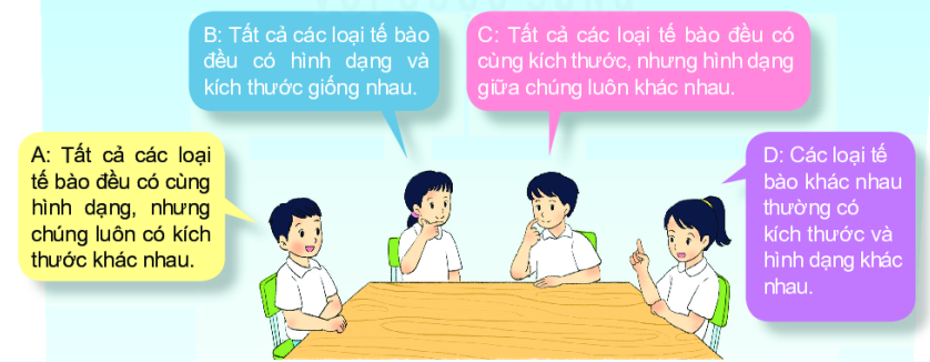 Bốn bạn học sinh phát biểu về hình dạng, kích thước của các loại tế bào khác nhau như sau: