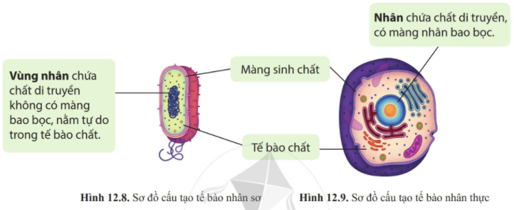 Quan sát hình 12.8, 12.9 và nêu cấu tạo của tế bào nhân sơ và tế bào nhân thực.
