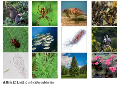 Một số sinh vật trong hình 22.1: khỉ, nhện, rùa, bọ, cá, chim, vi khuẩn, cây dương sỉ, cây thông, hoa sen