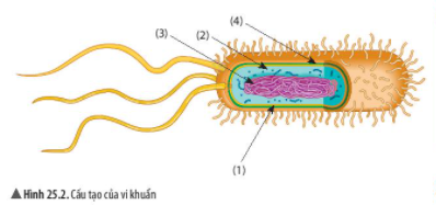 Quan sát hình 25.2, em hãy xác định các thành phần cấu tạo vi khuẩn bằng cách chú thích các phần được đánh dấu từ (1) -> (4).