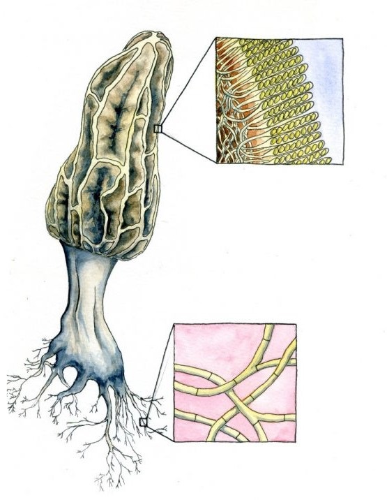 Nấm túi: các bào tử mọc phía trên mũ nấm.