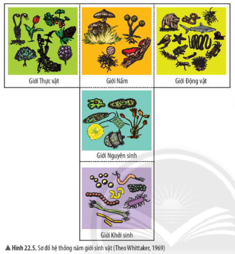 Quan sát hình 22.5, hãy cho biết sinh vật được chia thành mấy giới? Kể tên một số đại diện sinh vật thuộc mỗi giới.