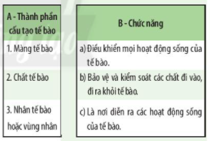 Xác định chức năng các thành phần của tế bào băng cách nối mỗi thành phần cấu tạo ở cột A với một chức năng ở cột B.