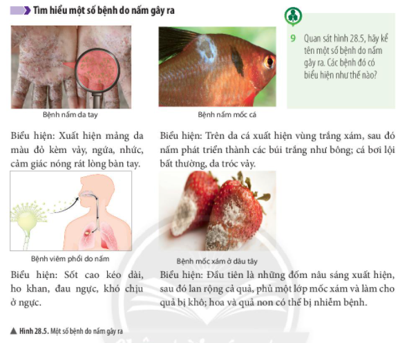 Quan sát hình 28.5, hãy kể tên một số bệnh do nấm gây ra. Các bệnh đó có biểu hiện như thế nào?