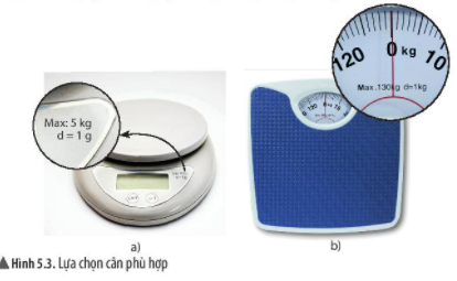 - Để đo khối lượng cơ thể ta dùng cân ở hình 5.3b vì cân có GHĐ là 120kg mà ước lượng thấy khối lượng cơ thể người nhỏ hơn hoặc có thể bằng 120kg và lớn hơn rất nhiều lần so với 5kg => Chọn cân ở hình b là phù hợp.
