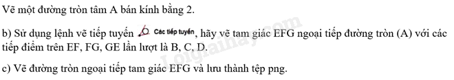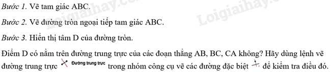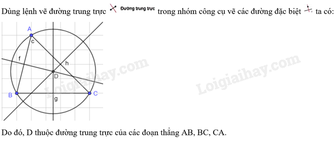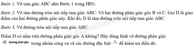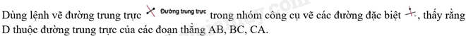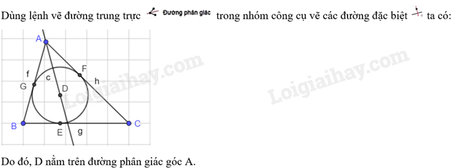 Điểm D có nằm trên đường phân giác góc A không? Hãy dùng lệnh vẽ đường phân giác trong nhóm công cụ vẽ các đường đặc biệt để kiểm tra điều đó.