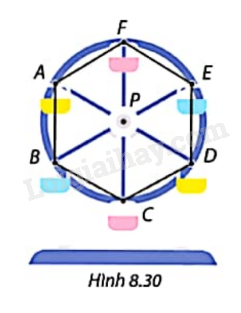 Một vòng quay có 6 cabin tại vị trí các đỉnh của một lục giác đều ABCDEF như Hình 8.30. Vòng quay này quay theo chiều quay kim đồng hồ. Tìm một phép quay tâm P (P là vị trí trục của vòng quay) để: