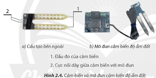 Em hãy mô tả cấu tạo bên ngoài của cảm biến độ ẩm đất ở Hình 2.4a.