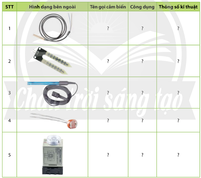 Em tìm hiểu và cho biết tên gọi, công dụng, thông số kĩ thuật của các cảm biến thông dụng trong Bảng 2.1