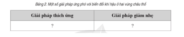 Sắp xếp các ý sau đây vào bảng để thể hiện đúng giải pháp ứng phó với biến đổi khí hậu ở hai vùng châu thổ.