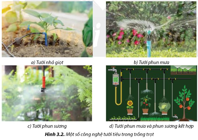 Quan sát Hình 3.2 và kể tên những công nghệ tưới tiêu thường được sử dụng trong trồng trọt hiện nay.