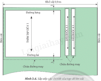 Quan sát Hình 3.6, giả sử vải có khổ rộng 0,9 m, em hãy tính chiều dài vải cần thiết để may được chiếc tạp dề có kích thước dài 45 cm, rộng 64 cm.