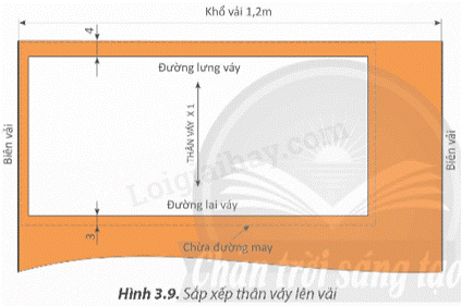 Dựa vào Hình 3.9, em hãy tính chiều dài vải cần dùng để may chân váy lưng liền đối với mỗi khổ vải 1,2 m; 1,6 m.