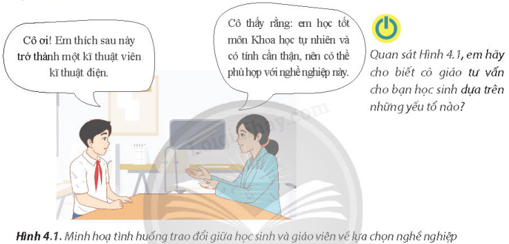 Quan sát Hình 4.1, em hãy cho biết cô giáo tư vấn cho bạn học sinh dựa trên những yếu tố nào?