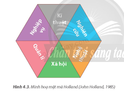 Hãy nêu tên một số nghề nghiệp phù hợp với từng nhóm tính cách theo lí thuyết mật mã Holland như minh hoạ ở Hình 4.3. Trong sáu nhóm tính cách nghề nghiệp đó, em phù hợp nhất với nhóm nào?