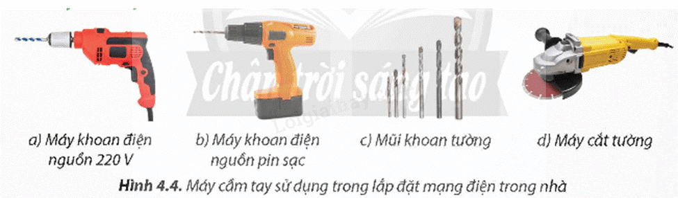 Quan sát Hình 4.4 và cho biết trong lắp đặt mạng điện trong nhà, máy khoan điện và máy cắt thường được sử dụng trong những trường hợp nào.