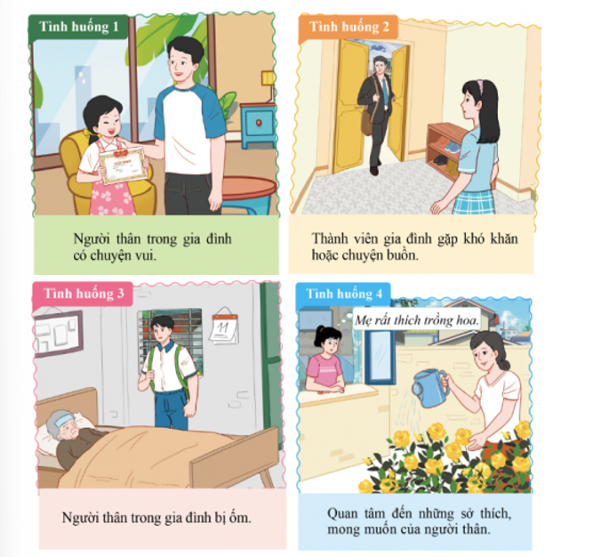 Sau khi quan sát các tình huống đóng vai thể hiện sự quan tâm, chăm sóc đến người thân, em có cảm nghĩ gì? Liên hệ với những hành động tương tự của bản thân em trong gia đình.