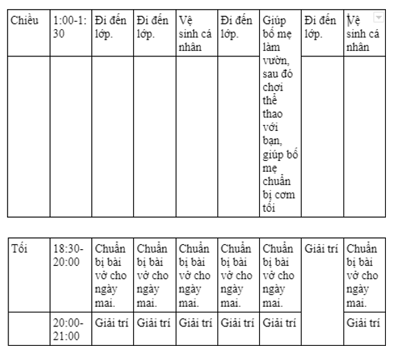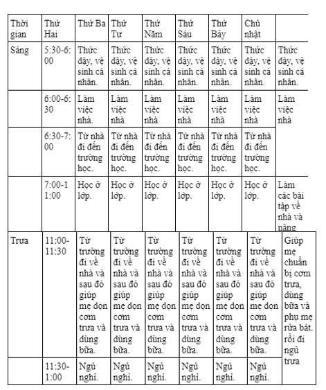 Lập thời gian biểu các công việc của em trong một tuần