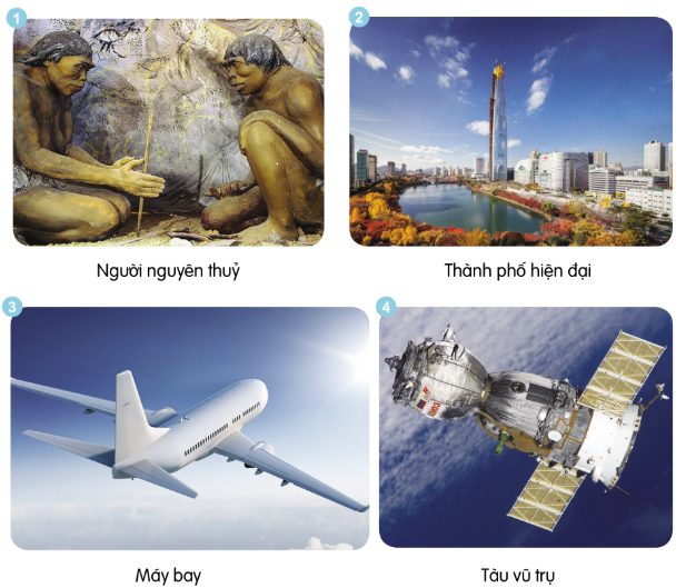 a) Những điều em quan sát được ở mỗi hình ảnh là: con người thời nguyên thủy, nhà cửa, thành phố hiện đại, máy bay và tàu vũ trụ.