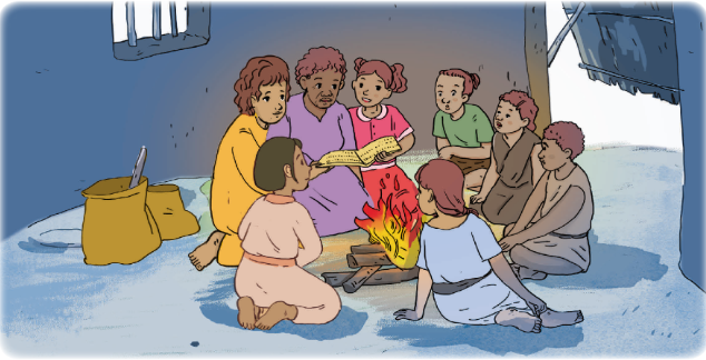 Tôi nhìn qua khe cửa. Khoảng sáu, bảy đứa trẻ ngồi quanh bếp lửa. Cạnh chúng là một phụ nữ trẻ và một bà lão. Hai người lớn chụm môi cố vật lộn với mấy từ khó. Ngón tay họ dò trên chính cuốn sách mà Giên mượn về. Đám trẻ con đã đọc xong, ngóng cổ chờ hai người phụ nữ đánh vần nốt. “Cô giáo” Giên đang nhiệt tình chỉ bảo “học trò”.