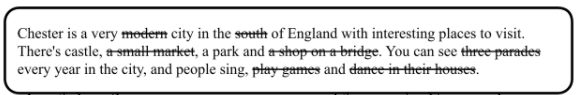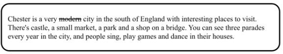 This year, the trip is to Chester in the north of England. It’s smaller and older than our city, but our teacher, Mr Swift, says it’s really nice. In the centre, there's a castle, a big market, a new shopping centre, a park and a very famous clock on a bridge!